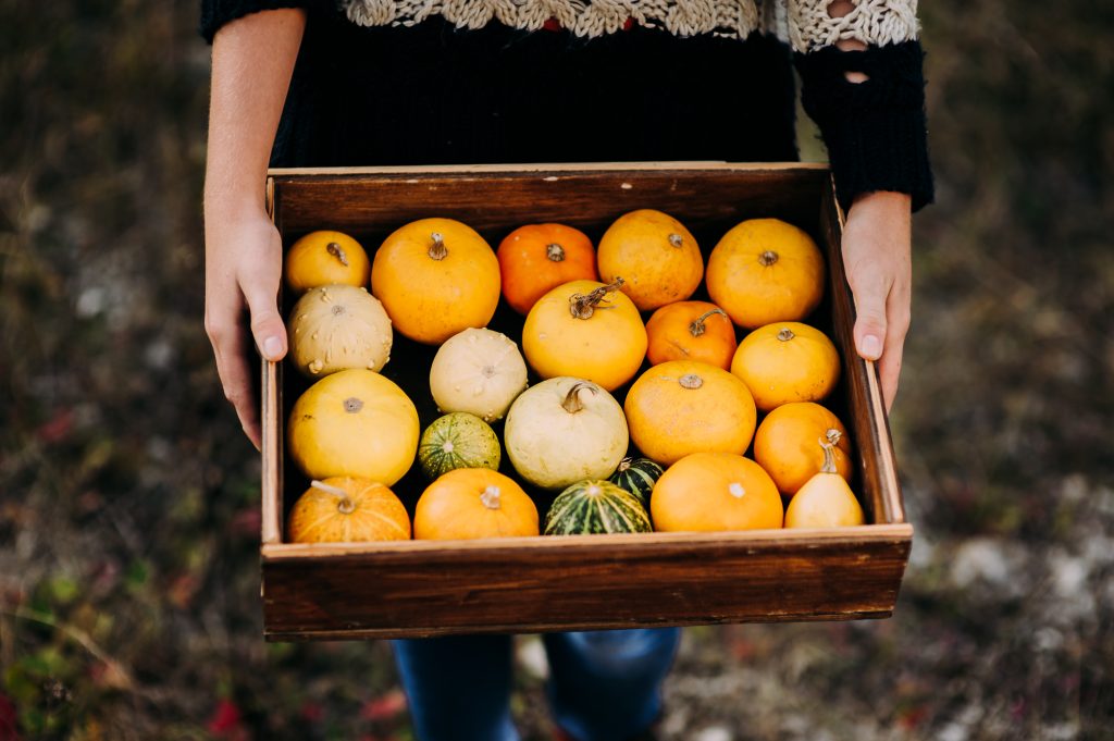 pumpkins in a box on a wooden surface