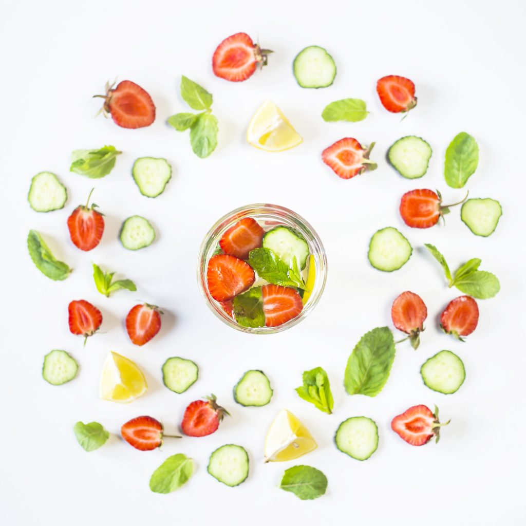 A glass of water with the addition of strawberries, cucumber, mint and lemon. In a circle of bright ingredients on a white background. Detox and Sports Concept. Top view, flat lay